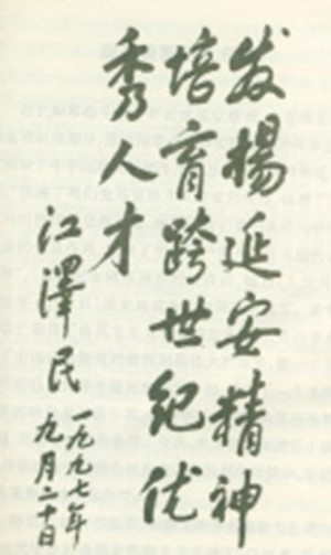 5.自力更生、艰苦奋斗的延安精神没有过时。抗日战争、解放战争的艰苦岁月要发扬延安精神,社会主义初级阶段也离不开延安精神,否则,我们的社会主义是很难建成的。——江泽民(1989.9)[1]