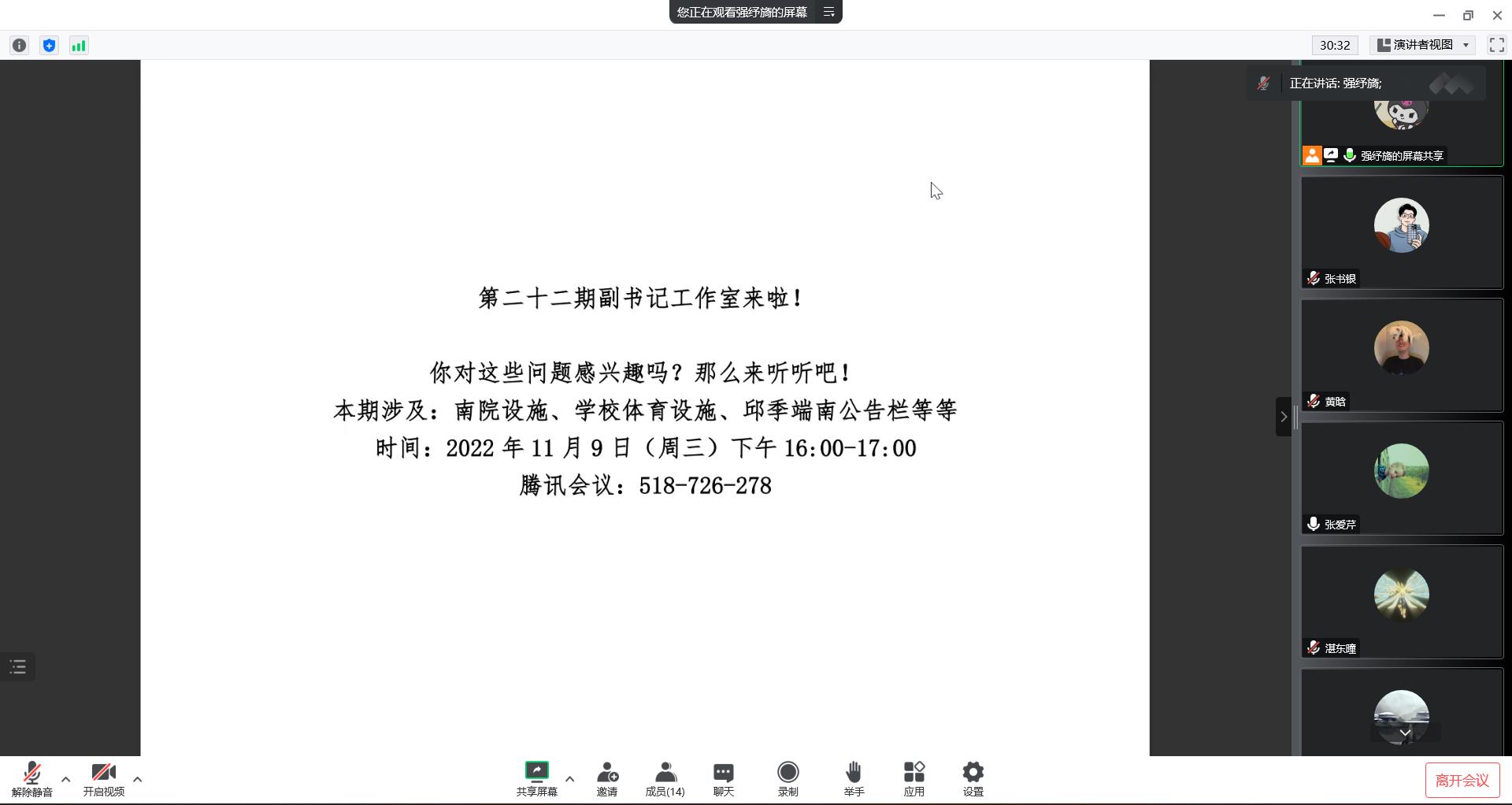 2022年11月9日下午16:00,学院组织开展了第二十二期“副书记工作室”交流会,聚焦南院设施、学校体育设施、邱季端南公告栏等话题。本次会议由于疫情线上举行,党委副书记张爱芹老师与会,研究生会权益部副主席强纾旖主持。以下是问题解答: