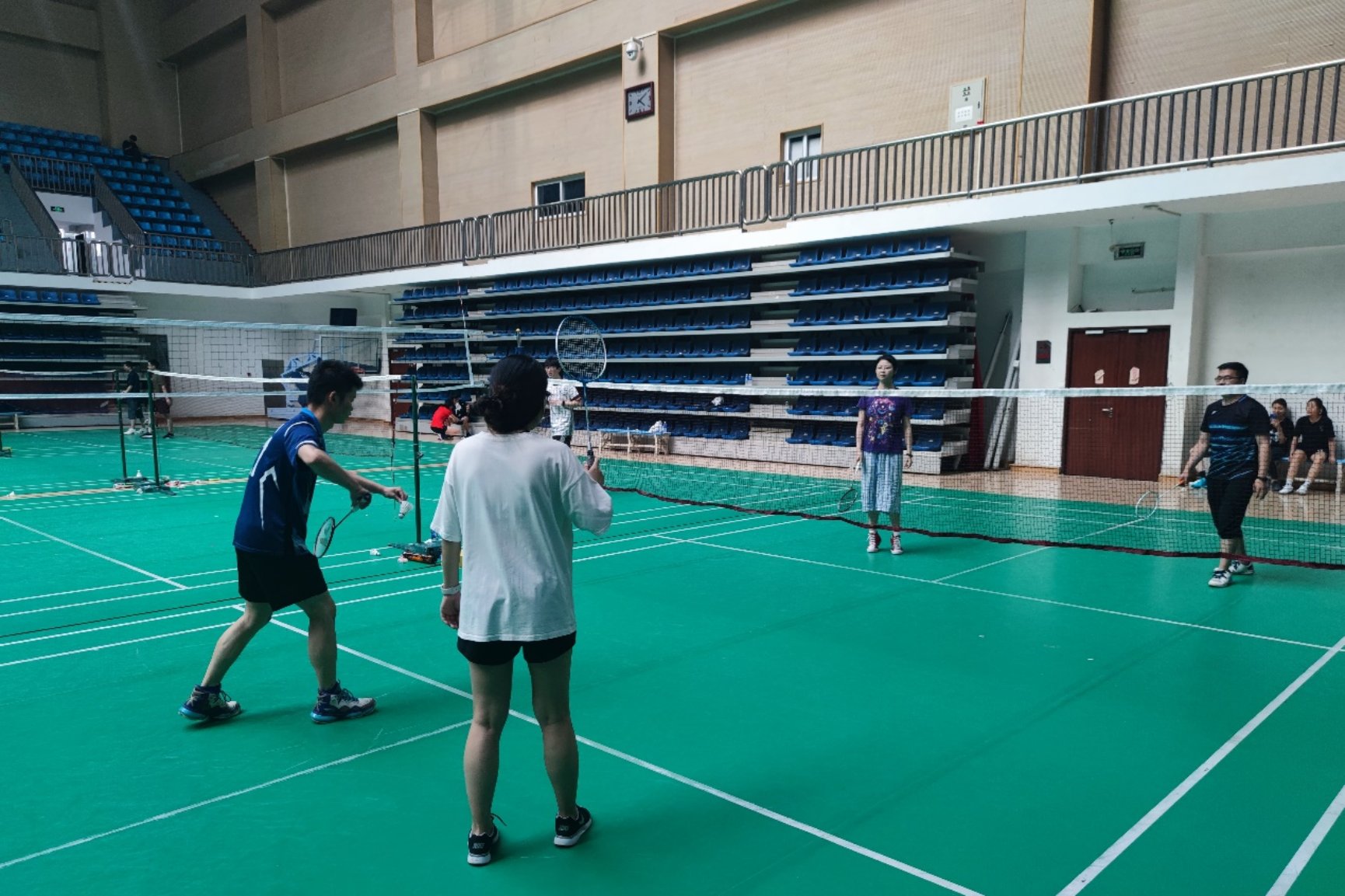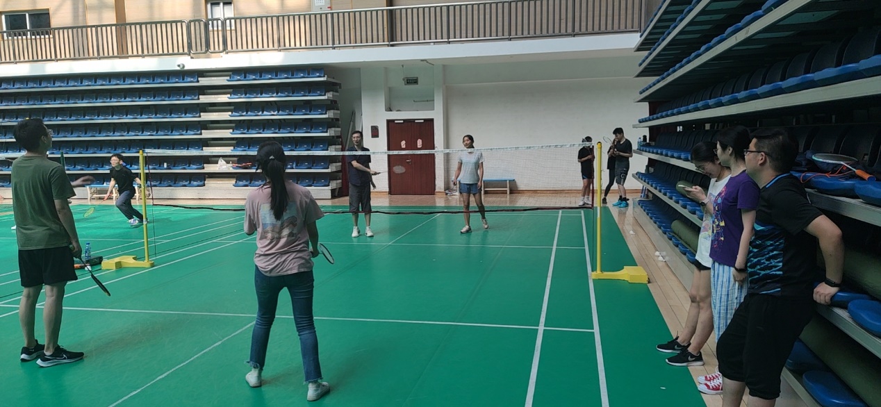 同学们两两组成队伍轮流进行双打,为确保各队强度接近多是男生-女生的组合。尤其研一同学参与积极性很高。