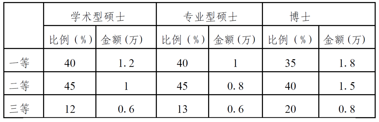 硕士研究生和博士研究生均按参评人数5%评定,奖金金额为0.2万/人·年。