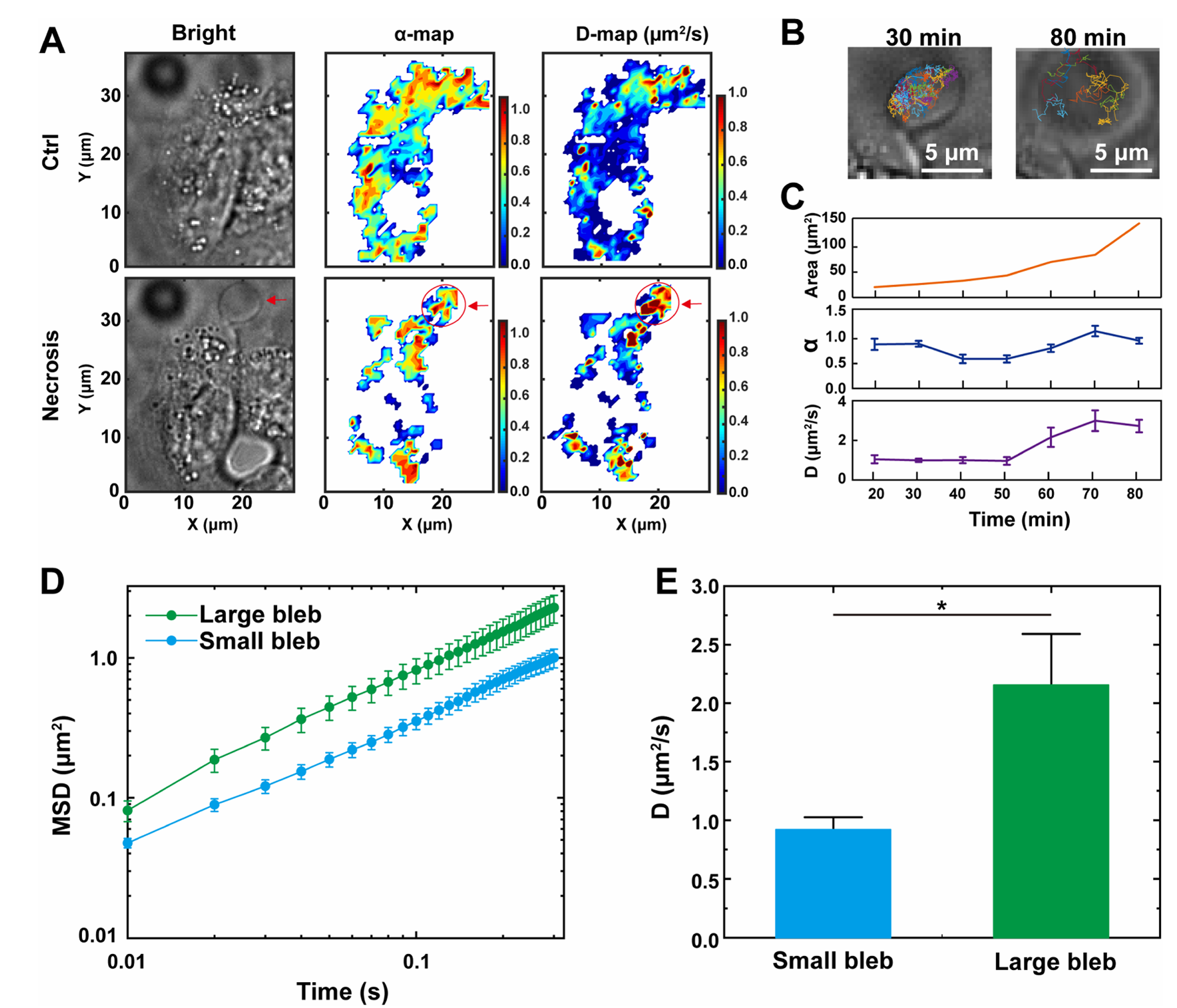图2 坏死细胞内扩散动力学呈现空间异质性增强,特别是起泡区域的扩散速度加快