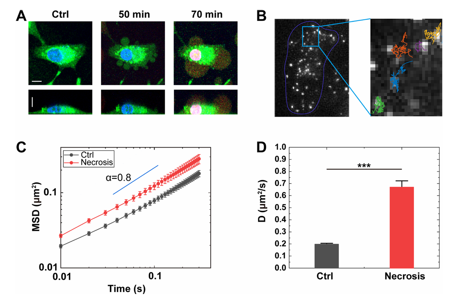 在这项研究中,研究人员利用量子点作为荧光探针,通过单粒子示踪技术,测定了坏死过程中细胞内部的扩散动力学。研究发现,坏死细胞内的扩散速度增加(图 1),并且随着坏死细胞外侧起泡(blebbing),扩散的空间异质性进一步增强。研究还发现,起泡的尺寸与内部量子点的扩散速率呈正相关(图2)。以上结果表明,随着坏死细胞肿胀,细胞体积显著增加,导致细胞内部分子拥挤程度降低,从而提高了胞内的扩散速度。
