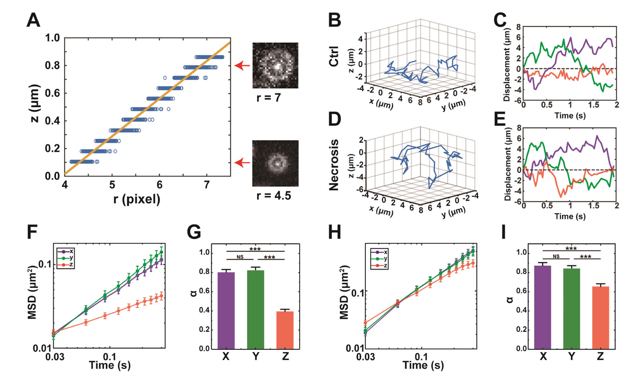 进一步,利用量子点的三维单颗粒示踪技术,发现细胞内部的三维扩散模式从各向异性转变为准各向同性,表明细胞内环境在坏死过程中发生了重构,特别是缓解了对细胞内部扩散的纵向约束。这些发现揭示了坏死过程中细胞内扩散动力学和结构演化特征,为理解细胞死亡的非平衡物理过程提供了新的理解(图3)。