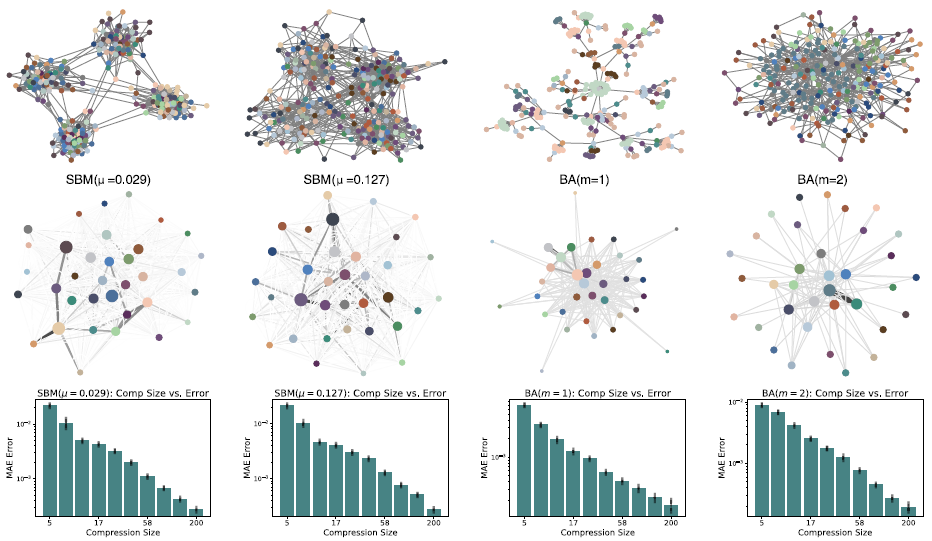 首先,可以发现模型的表现并不会随着数据所属领域而呈现出不同,但的确存在着网络的结构属性将会对模型的粗粒化后保留配分函数的精确度造成显著影响,那就是原始网络的密度,如图5右图所示:原始网络密度和压缩后的配分函数误差近似呈现幂律关系。这或许是因为更高的密度意味着更高的信息传递方式的多样性,从而使粗粒化难度增大。