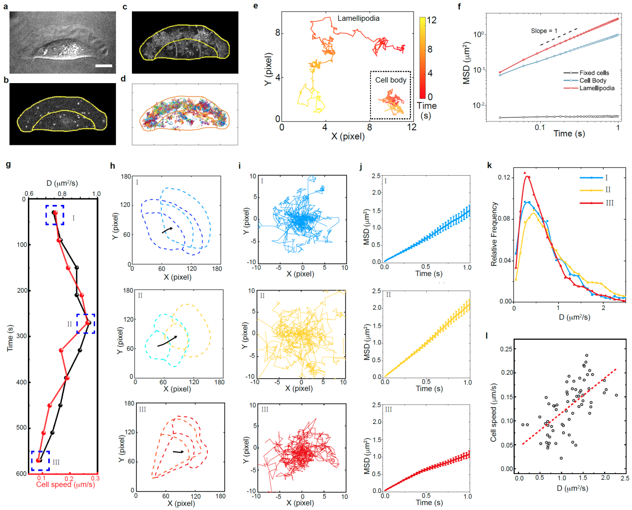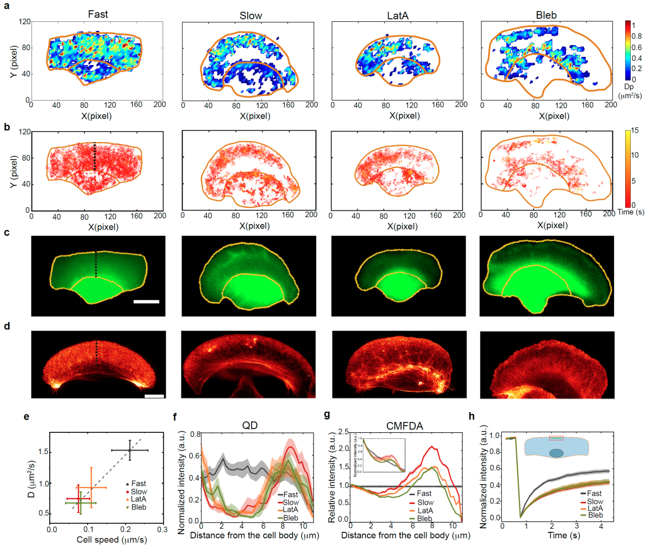 图2. 发现新的细胞慢速迁移模式。与传统的细胞快速迁移模式不同,在慢速迁移细胞中。其板状伪足前高后低、胞内扩散速度降低,生物大分子局限于伪足前端。