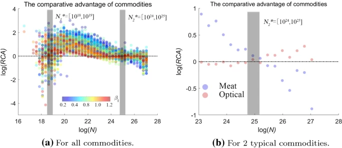 近期,万博体育app 陈清华教授团队与经济与工商管理学院蔡宏波教授合作,基于1995年至2015年的联合国商品贸易统计数据,系统地分析二十年来世界各国贸易结构与经济增长的演化关系,并尝试探究全球贸易网络的整体性演化规律和各国商品结构的一般性升级路径。在理论分析中,该团队使用显性比较优势(Revealed Comparative Advantage, RCA)来描述全球贸易网络中各个国家在不同类商品上的优势特征,并结合对商品规模特征(scalecharacteristics)的假设,得到描述RCA演化的状态方程,这有助于分析各类商品的比较优势随经济规模(N)和商品技术含量(β)的演化规律。通过对状态方程求解得到两个鞍点,并且,世界200个国家商品贸易统计数据也验证了这两个鞍点的存在(图1),从而揭示了二十年间全球贸易中比较优势演变的若干统计性规则。