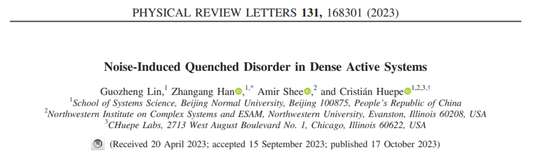 近期,Physical Review Letters 期刊发表了题为“Noise-Induced Quenched Disorder in Dense Active Systems”的论文(如图1所示),发现由相互排斥的个体组成的密集集群系统能够产生一种新的淬火无序态 (Quenched disorder),该状态展现出短程的有序和长程的无序,与在复杂系统中被长期研究的自旋玻璃态类似。该论文以万博体育app 为第一单位,由万博体育app 韩战钢教授作为通讯作者、林国政博士作为第一作者,联合了美国西北大学的 Cristian Huepe 研究员(共同通讯作者)和Amir Shee 博士后,于 2023 年 10 月 17 日上线于 Physical Review Letters 期刊官方网站。