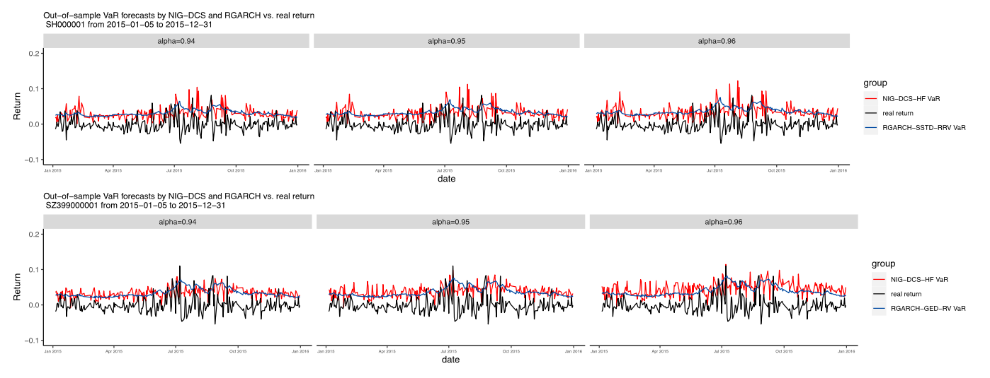 该研究对日内收益的条件分布的动态参数建立条件得分驱动模型,该模型可同时通过尺度参数和形状参数来更新日内收益的条件分布形态,达到动态预测的目的。由NIG分布的特殊性质,可以直接根据日内高频收益的参数加总得到日收益分布的参数,从而确定日收益分布的形状,进而实现对VaR的动态预测,这种有机结合高频数据的参数驱动模型是新颖的。