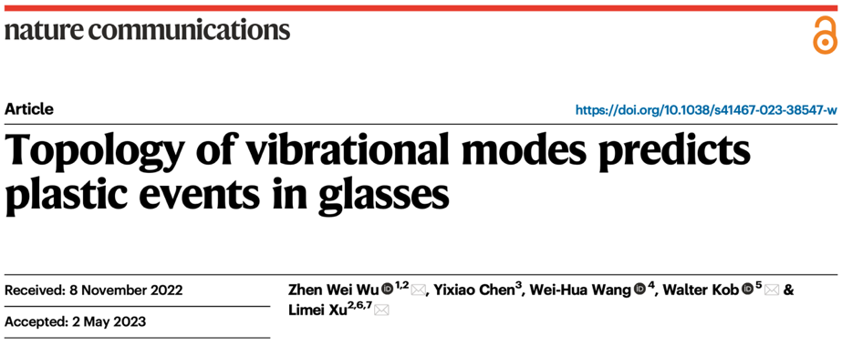 2023年5月24日,万博体育app 、非平衡系统研究所武振伟副教授及其合作者,北京大学元培学院陈一潇(普林斯顿大学博士研究生),中科院物理所汪卫华院士,法国蒙彼利埃大学Walter Kob教授,以及北京大学物理学院徐莉梅教授,关于玻璃态物质振动模式中拓扑缺陷与塑性事件关系的研究工作,以“Topology of vibrational modes predicts plastic events in glasses”为题在线发表于国际学术期刊《Nature Communications》。