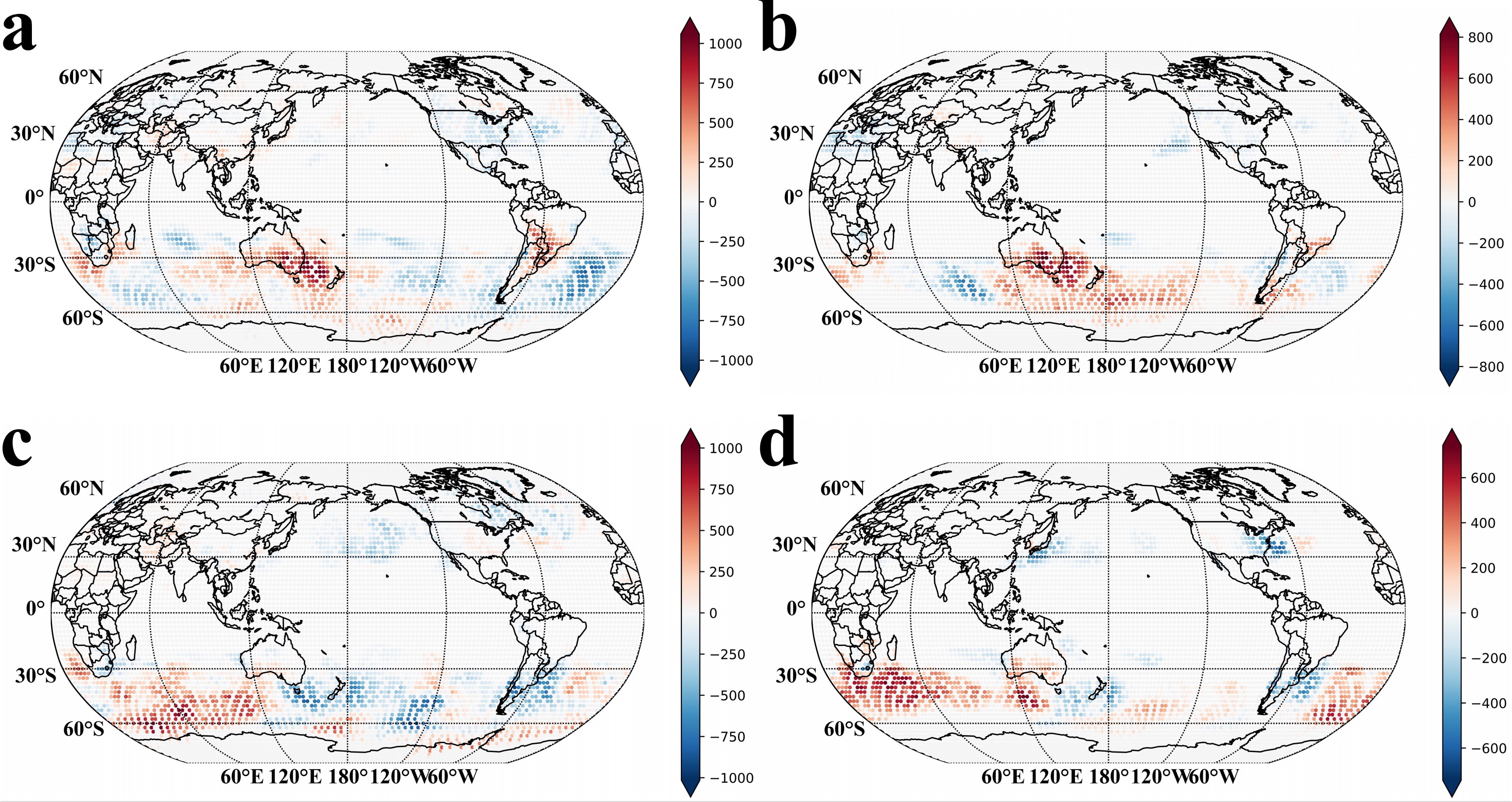 图1揭示了气候遥相关在南北半球的分布、传播方向和强度差异,以及挖掘出受遥相关影响较大的一些重要地区。最后,对比分析了全球变暖背景下共74年的遥相关演变结果,包括分布格局和强度特征,并找到了几个“热点”气候敏感区(如澳大利亚东南部、南美洲南部和南非),见图2。此外,文章结果分析表明,随着时间的推移,遥相关的强度正在增加,这可能与气候变化、全球变暖、人类活动和气候临界点的激活有关。