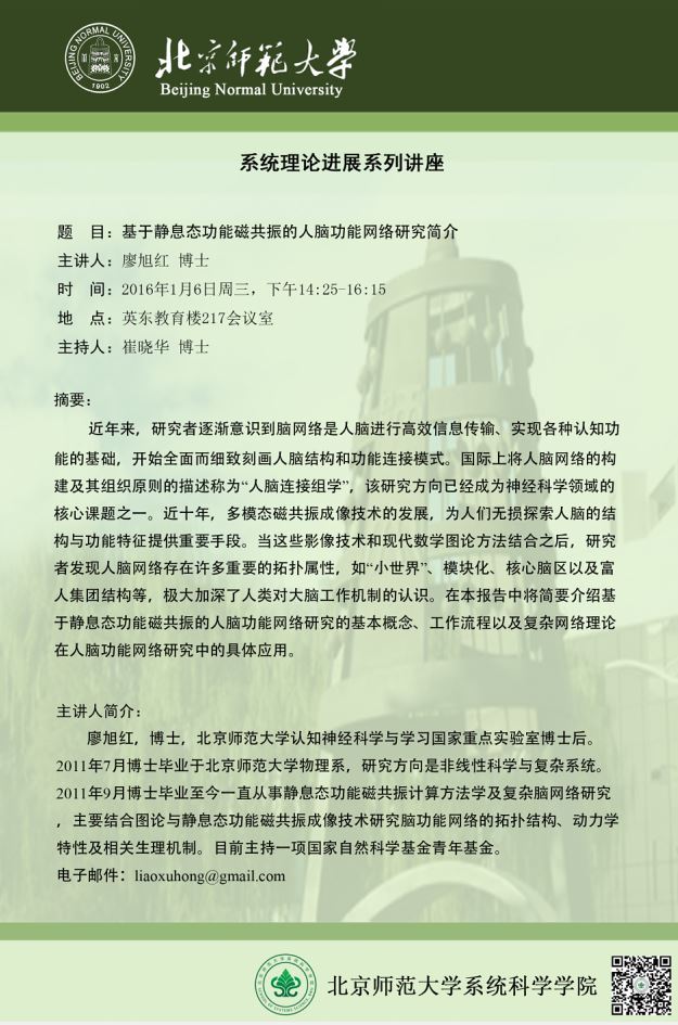 [讲座] 基于静息态功能磁共振的人脑功能网络研究简介