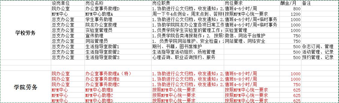 勤工助学是全面提升学生综合素质、提高学生实际工作能力、增强学生社会责任感、培养学生自立自强精神的重要途径,也是我校家庭经济困难学生资助工作的一个重要内容。万博体育app 现公开本学期勤工助学岗位招聘信息,请有意向的同学在3月2日(本周五)前将附件中的申请表发送到wanboty8.com(只交电子版即可),有问题请联系李老师58804138。