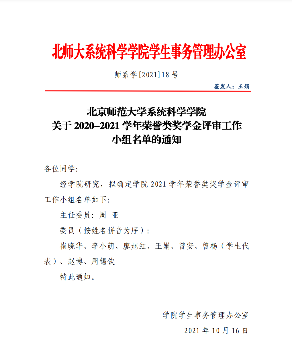 关于2020-2021学年荣誉类奖学金评审工作小组名单的通知