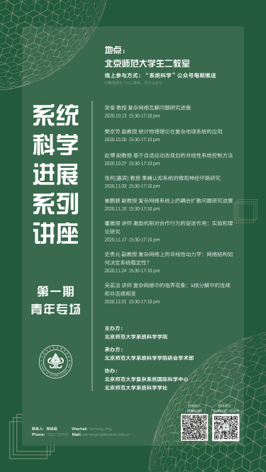 为提升研究生学术视野,辅助学院培养复合型人才,学院学生工作执委会学术部(简称学术部)于10月中旬牵头举办了“系统科学进展”系列讲座活动。经学院推荐,学术部积极协调,目前讲座已邀请到万博体育app 从事系统科学研究的优秀青年教师,他们会结合系统科学学科的前沿课题展开报告,欢迎广大师生参与,期望大家在思想上碰撞出精彩火花!