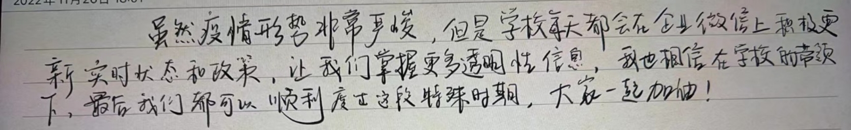 结合当前的防疫形势,张老师也在会上对大家进行了防疫教育。强调疫情防控压力依然很大,社会面形势仍不容乐观,在同学们积极配合学校隔离政策的同时,也希望大家保持乐观愉悦的心情。同学们也写下了自己的感受和期许。至此,此次会议圆满结束。