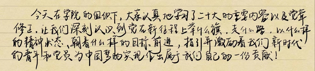 最后,同学们交流了此次学习的体会,并以手写的形式留作记录。大家表示此次活动加深了自己对二十大精神的理解,同学们将认真学习不负韶华,不负这个大好的时代,踔厉奋发,勇毅前行。