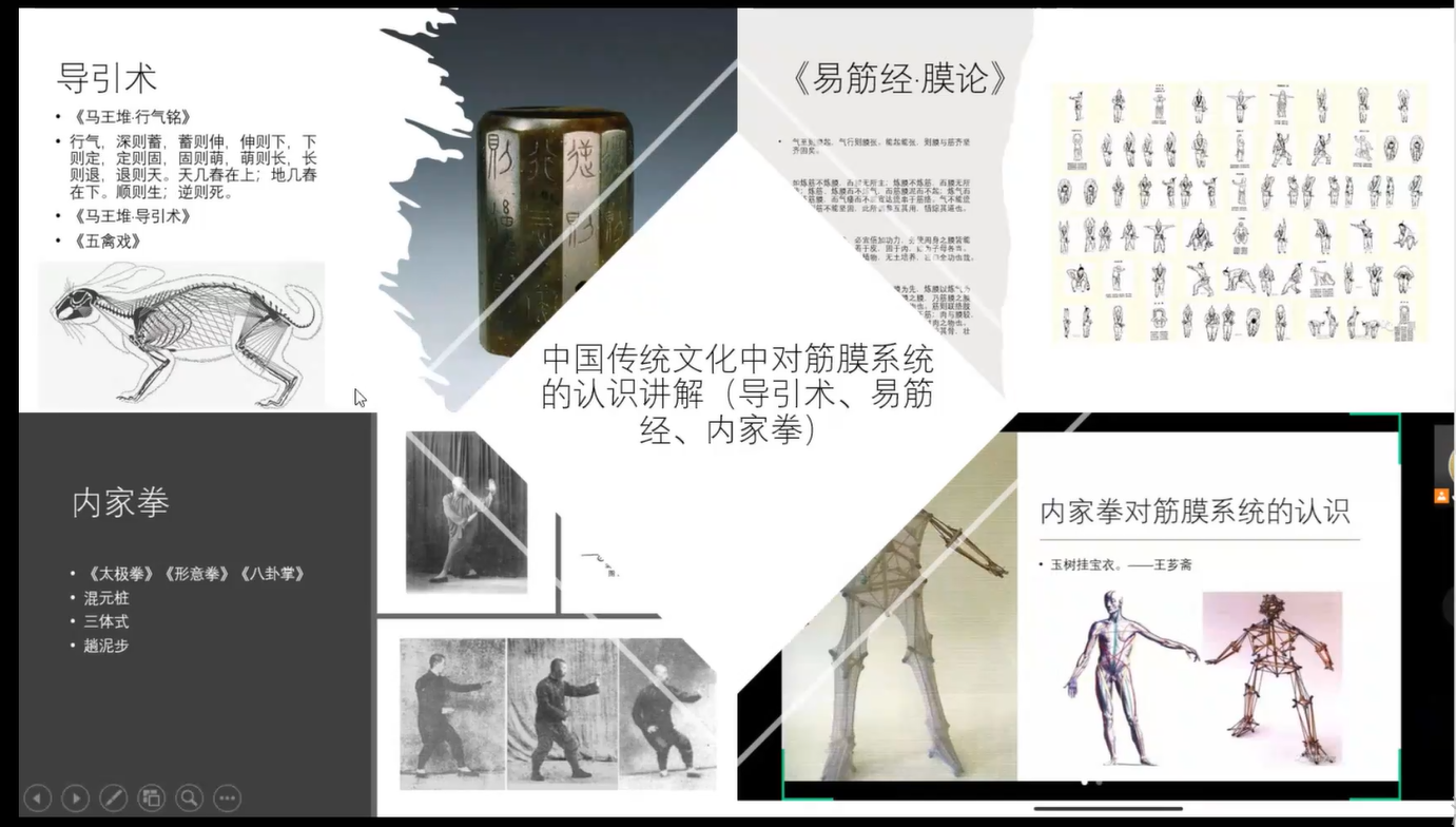 主要基于《解剖列车》前两章筋膜基础理论讲解讨论,DW《Fascia(筋膜》系列纪录片观看讨论,筋膜-骨骼的张拉整体结构讲解,中国传统文化汇总对筋膜系统的认识讲解(导引术、易筋经、内家拳)。