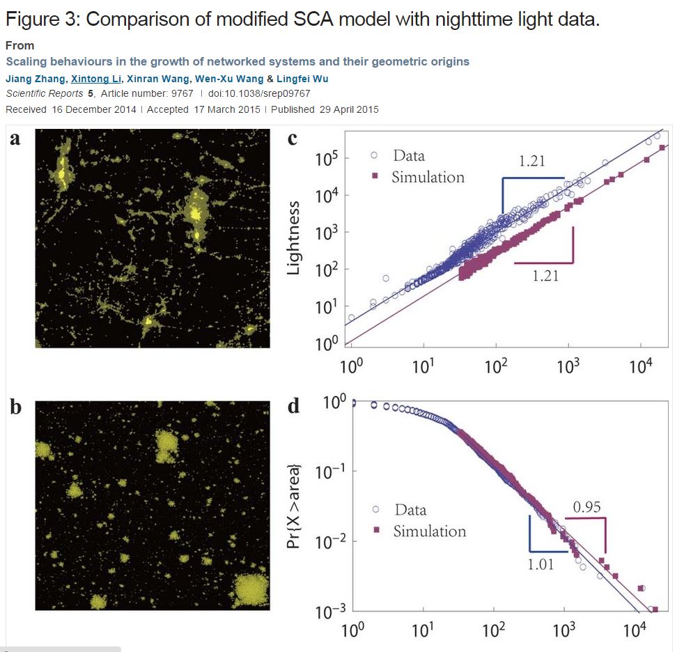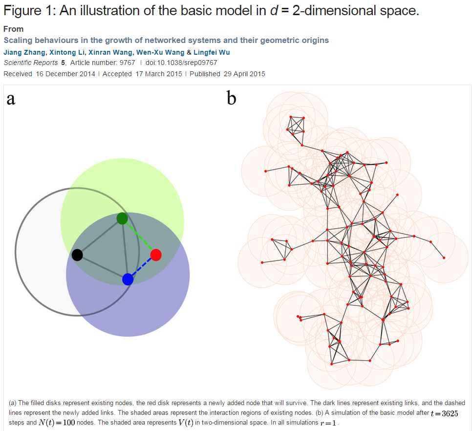 研究成果:Jiang Zhang*, Xintong Li, Xinran Wang, Wen-Xu Wang, and Lingfei Wu, Scaling behaviours in the growth of networked systems and their geometric origins, Scientific Reports, 2015, 5 : 9767