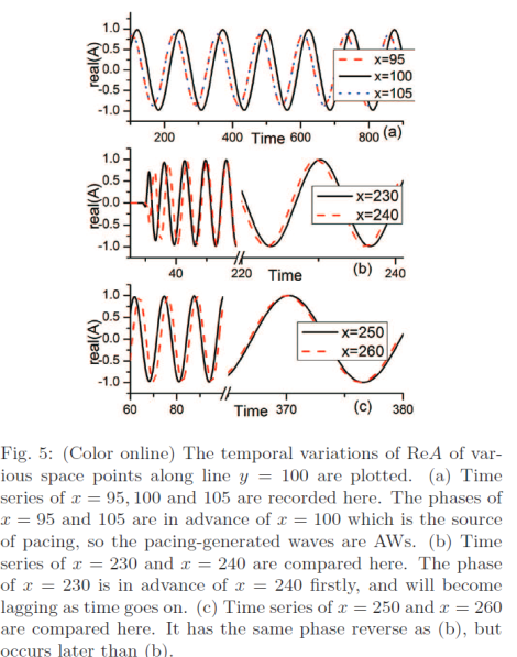 Fig1. Target wave imagery is observed in the right medium. The imaging target waves are NWs which are observed by continuous snapshots of spatial patterns. In other words, the pacing-generated target waves which are AWs propagate, crossing the interface, and then form the imaging target waves in the right medium.