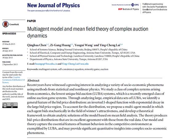 陈清华副教授、王有贵教授和亚利桑那州立大学来颖诚教授、兰州大学黄子罡教授合作研究的“Multiagent model and mean field theory of complex auction dynamics”已被《New Journal of Physics》接受并于9月2日刊出。