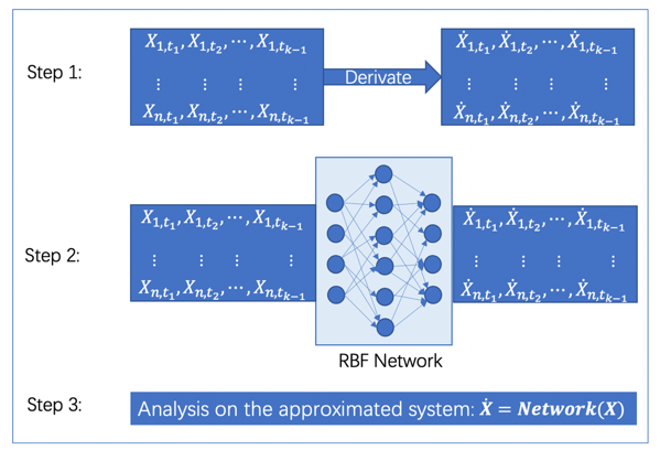 该方法包括三个步骤,首先从观测数据的数值微分以获得相应的导数序列,然后通过有监督的学习训练一个径向基函数(RBF)网络,最后把训练完成的网络看作是系统演化的动力学方程开展常规的动力学分析。这个分析可以近似地反映原系统的动力学性质。
