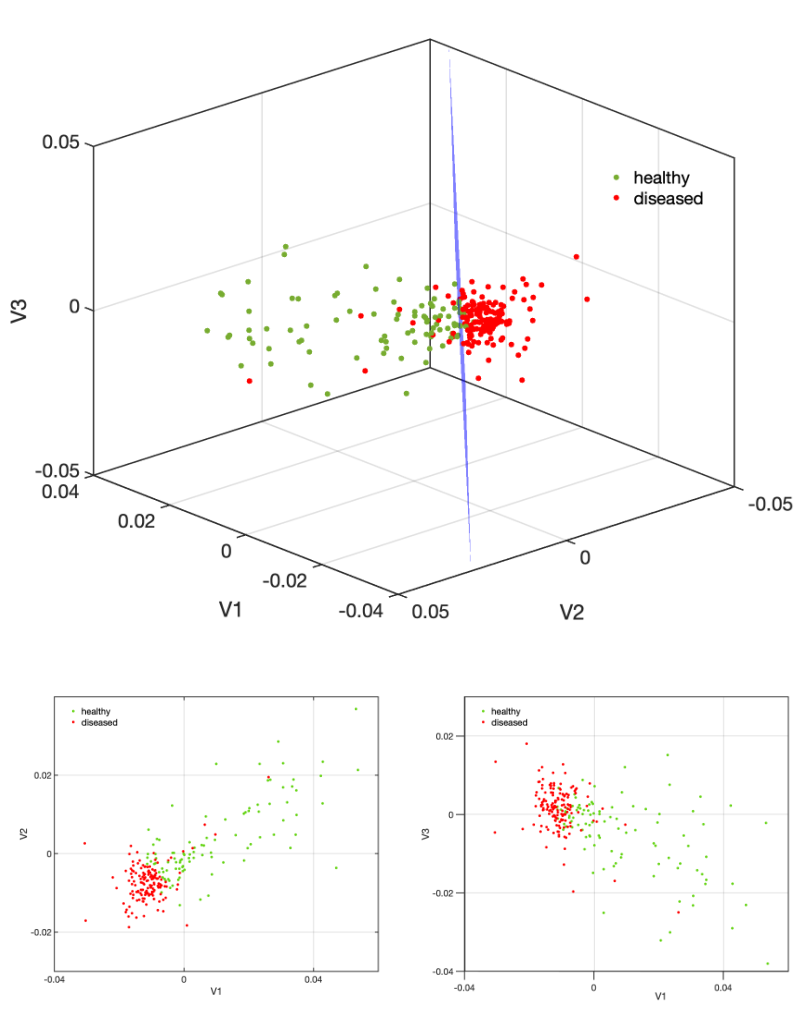 更重要的是,这一方法也被成功应用于心电图(ECG)数据。对249名被试的心电数据,依据其疾病状态进行分组训练。通过PSO算法找到了各自网络的平衡点。如图3所示,健康与患病个体在平衡点上呈现出明显的分簇,证实了RBF网络不仅可以重构心脏动力学系统,还能捕获到原始系统的关键动力学特征。