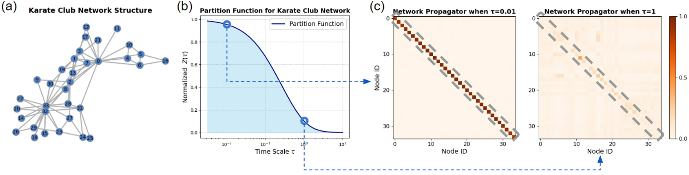 图1展示了一个经典的复杂网络空手道俱乐部网络及其配分函数,可以看到,配分函数是一个单调递减的函数,横坐标是扩散时间,纵坐标的归一化配分函数值代表留在原始节点的信息量。在扩散开始时,所有信息都留在原始节点,配分函数取到其全局最大值,随着扩散的进行,最终信息均匀地分布在所有节点上,配分函数降至全局最低点。其特性类平衡态统计物理系统中,系统状态随着温度降低而变化。而这一曲线体现了信息传播的动态,例如当网络更加稠密时,配分函数会以更快的速度下降,当网络存在明显的社团结构时,局部信息传播速度很快而全局信息传播受到桥节点数量的限制而很慢,在配分函数上将会体现为前段速降而后段缓降的情况。因此,配分函数是一个对信息传播动力学在不同时间尺度的详细而综合的描述。