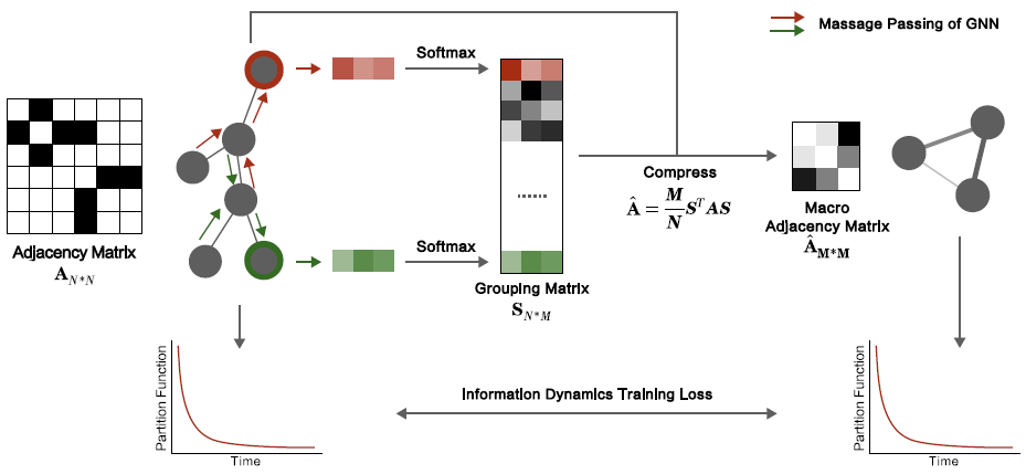 研究者们进一步分析了模型的可解释性,尤其探索了将相似局部节点粗粒化为相同超级节点的这一策略。首先,需要意识到这本身是图神经网络的自然选择,因为图神经网络以节点的局部特征作为输入,并输出节点分组。但这一天然策略本身也十分契合压缩网络尺寸并保留信息动力学行为的目标,如图5所示: