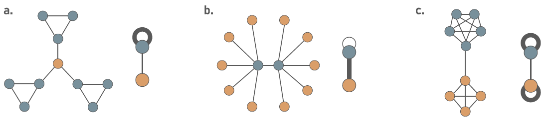 具有高聚类系数的节点通常其邻近节点之间存在较多互连,在网络中的信息扩散过程中,这些互连会起到将信息局限在局部的作用。当高聚类系数的节点被归为一组时,它们之间的众多互连会转化为超节点上的高权重自环,从而继续发挥局限信息于局部的作用,如子图a所示。