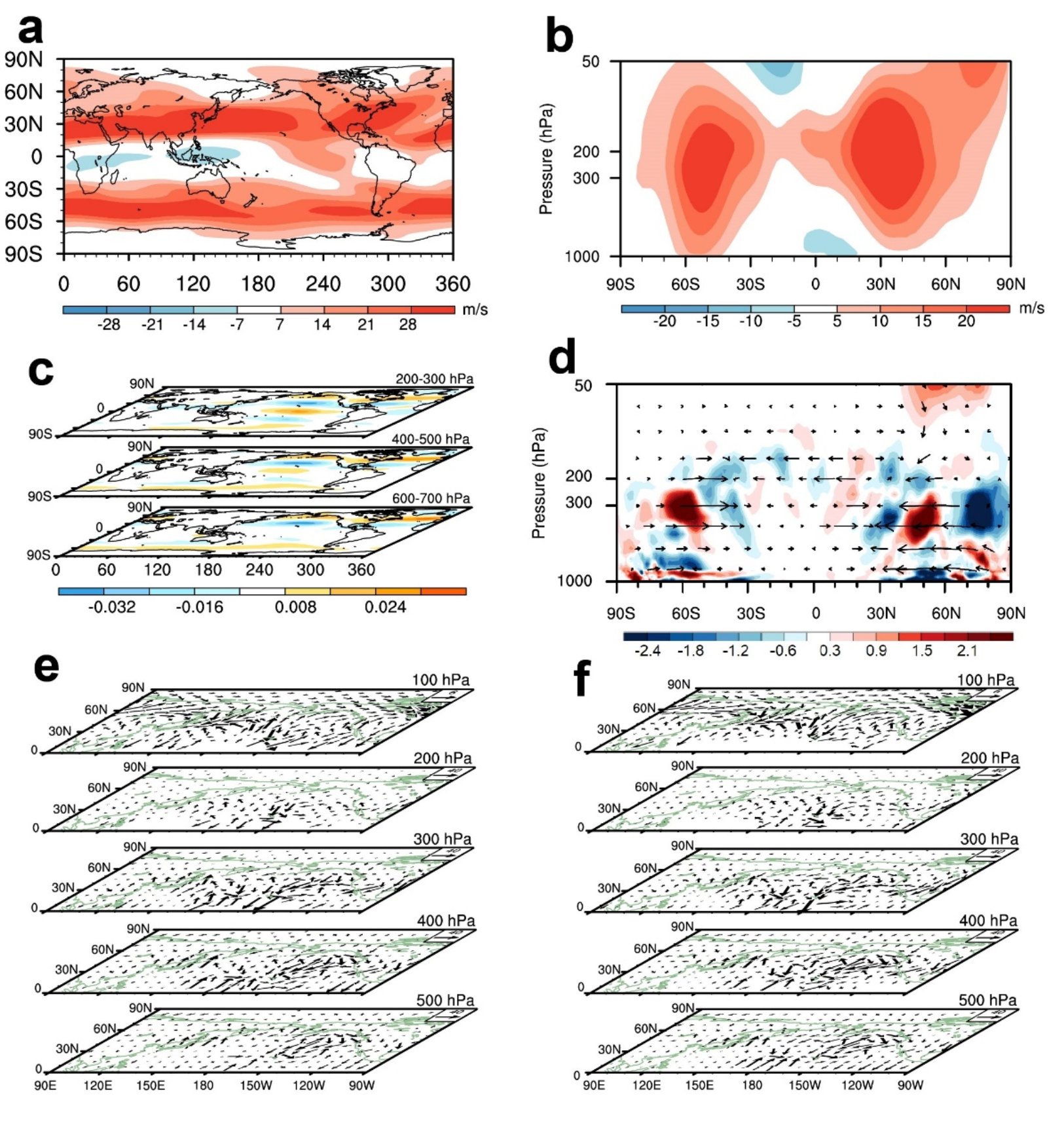 图2:(a)2月200-300 hPa的纬向风场气候态以及(b)区域平均(180-60°W)的纬向风气候态。(c)2月纬向风EOF第一大模态的空间分布。(d)根据2月APV强弱事件(以正负一倍标准差区别)合成的E-P通量及其E-P通量散度异常。(e)1979-2022年2月强弱APV事件合成的三维波通量异常(Takaya和Nakamura,2001),使用的为ERA5数据。(f)同(e),但为JRA-55数据。