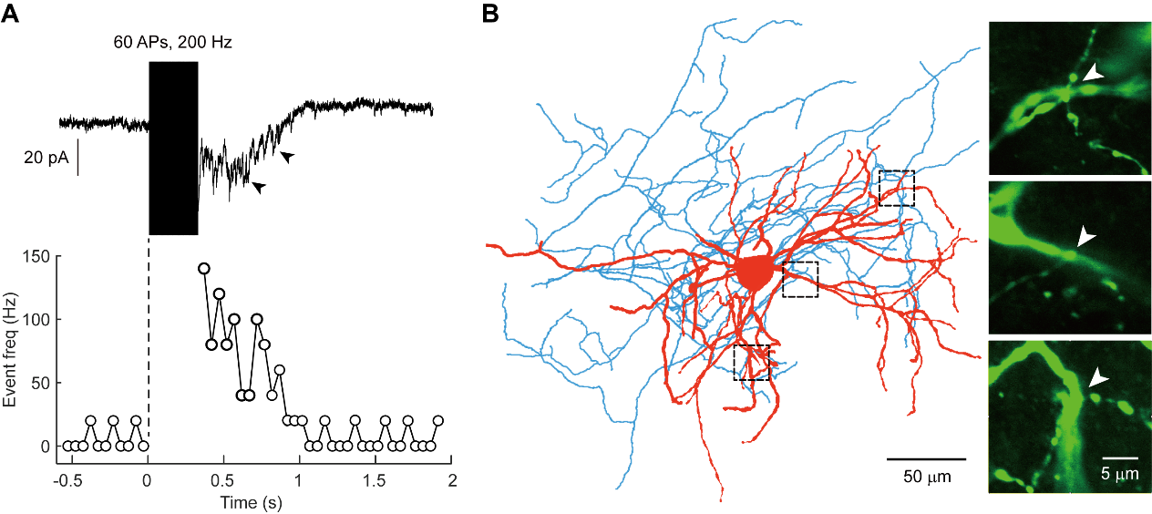 近期,万博体育app 王大辉教授团队博士生王轩与复旦大学脑科学转化研究院舒友生教授团队合作,结合神经科学的实验技术和神经系统的计算模拟,对纹状体神经元的自突触进行了深入探索。在急性分离的小鼠脑片上,研究人员对纹状体神经元进行全细胞记录,利用动作电位高频爆发后自突触上延迟出现的神经递质非同步化释放(asynchronous release, AR)现象来识别记录的神经元是否具有功能性自突触。惊讶的是,所有记录到的SPN在动作电位爆发后都没有自突触的AR现象,即使是在细胞外液中存在促进AR的锶离子(Sr2+)的情况下也没有出现AR,提示SPN并没有发育出自突触结构。相反,在另一类纹状体神经元,即小清蛋白(Parvalbumin,PV)阳性的中间神经元上,我们在约半数的记录细胞中观察到了稳定的自突触AR事件(附图A),同时在形态学上也观察到了可能的自突触位点(附图B)。