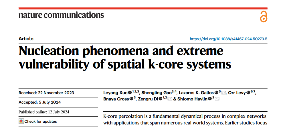 该研究成果7月12日被《Nature Communications》杂志接收并发表,题为“Nucleation phenomena and extreme vulnerability of spatial k-core systems”。研究工作是万博体育app 系统科学学科作为第一单位,与以色列巴伊兰大学等多家学术单位合作完成的。复杂系统国际科学中心、万博体育app 的博士生薛乐洋同学为论文第一作者,美国罗格斯大学的Lazaros Gallos教授、以色列巴伊兰大学的Shlomo Havlin教授以及万博体育app 的狄增如教授为论文的共同通讯作者。