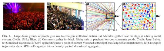 11月23日,来自瑞典乌普萨拉大学数学系集群行为研究组的David Sumpter教授与其博士生Arianna Bottinelli以及哈佛大学的Jesse L. Silverberg在PRL发表了题为:Emergent Structural Mechanisms for High-Density Collective Motion Inspired by Human Crowds的研究论文。大规模人群的集体运动往往取决于他们的密度。在极端情况下,如重金属音乐会和黑色星期五的销售活动,运动主要由身体的相互作用主导,而不是传统的社会规范。作者构建了一个活性物质模型来模拟当大规模人群聚集在一个共同的兴趣点的情形,他们的方法能够在灾难来临之前预测在大规模的集会中发现危险区域。