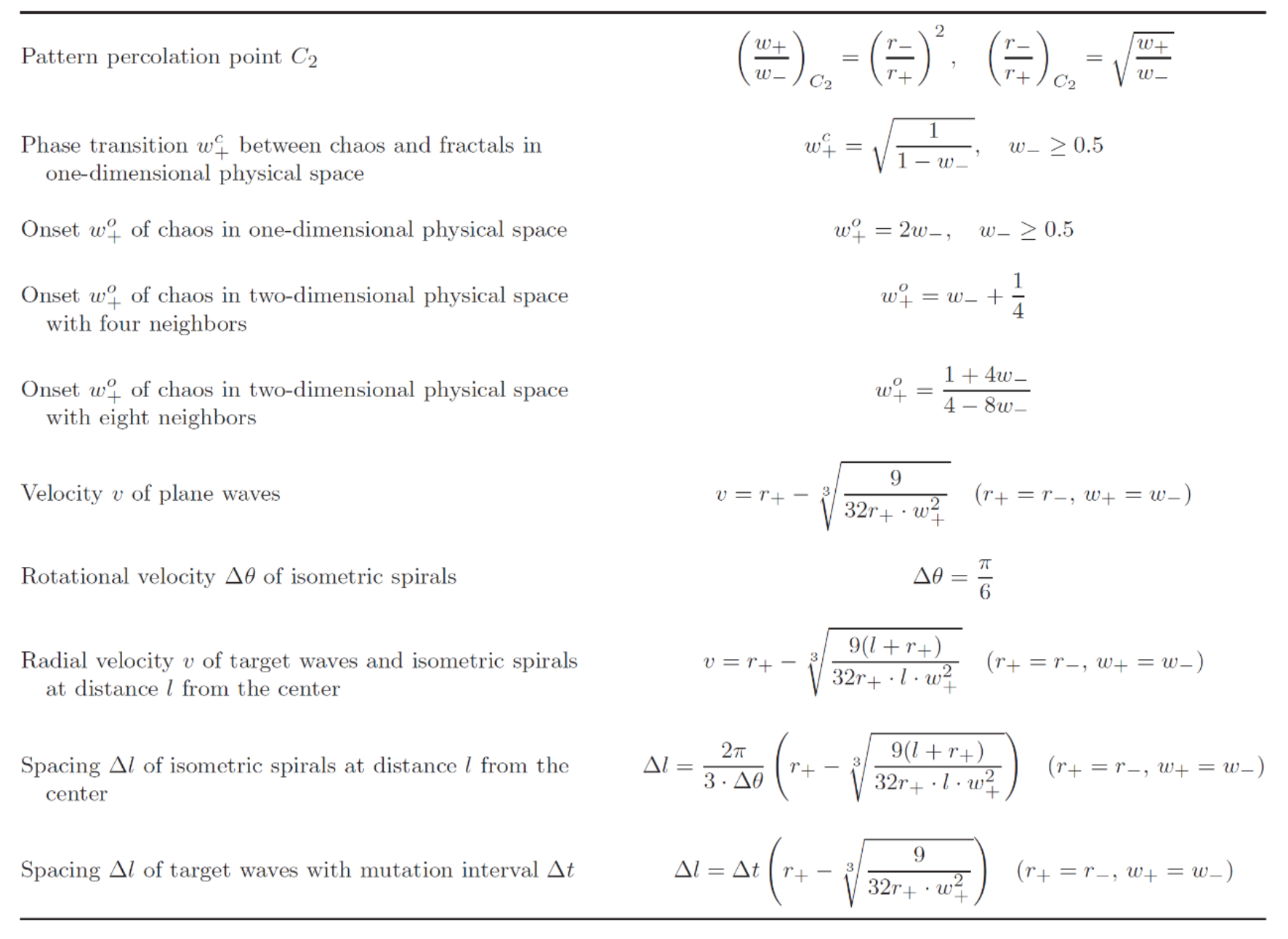 三条自组织规则的对称破缺组合能够产生自然界中的各种复杂现象和时空模式,包括各种图灵斑图(动物外表图案和玄武岩等)、分支分形(树、肺、河道)、地毯分形(海螺花纹)、螺旋波(阿米巴虫释放物质、化学振荡、海螺壳、飓风、星系)、靶波(心跳、生长因子)、平面波、时空混沌(混沌地毯和万花筒)、斑图渗流(非连续相变)、分形到混沌的相变(分形地毯到混沌地毯)、混沌和秩序共存(波的边缘混沌)等,具体发现如图3所示。在生成各种复杂现象的同时,课题组给出了斑图渗流相变的解析解、有限尺度标度分析、分形到混沌的相变解析解、螺旋波、靶波和平面波的各种特征的解析解(见表1)等。