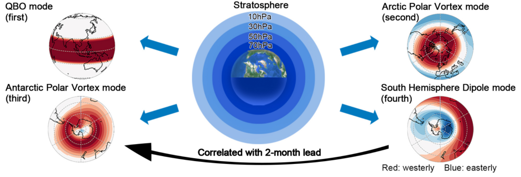 本研究基于ERA5再分析资料采用本征微观态方法,得到了70~10hPa平流层纬向风数据的前四大模态。其中,第一大模态对应平流层的准两年振荡(QBO,quasi-biennial oscillation)现象。第二模态对应北极极涡强度变化。我们发现,北极极涡模态的时间演化呈现出显著的约6年周期,而这一现象在前人的研究中并未被提及。我们的研究进一步表明,北极极涡的6年周期可能与北太平洋海温以及太阳黑子活动的共同作用存在一定关联。第三模态对应南极极涡强度变化。相对与北极极涡模态的变率最强出现在北半球冬季和早春,南极极涡模态变化最剧烈的时期集中在南半球的晚春和早夏,并且南极极涡模态展现出显著的约11年太阳黑子周期,而11年周期在北极极涡中不显著。南极极涡模态中11年周期更为显著的原因在于,南极极涡变率最强的时期恰好受太阳辐射影响较大。而北极极涡变率最强的时段仍处于极夜期间,太阳辐射影响较小。第四模态是本研究发现的一个新模态,其空间特征主要分布在南半球,并呈现出偶极子的形态。结果表明,第四模态与南极极涡模态(第三模态)存在相关性,并且其变化超前南极极涡模态约两个月。这一发现为南极极涡强度的预测提供了有价值的参考。