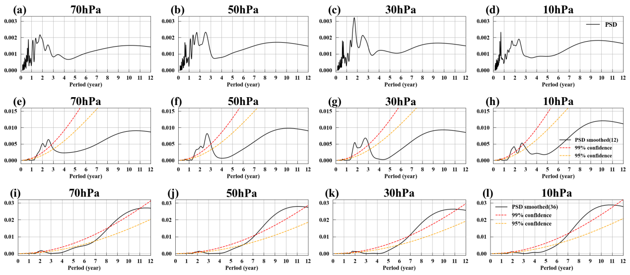图 3 南极极涡模态时间演化的功率谱密度及其显著性。第一行为70~10 hPa原始的功率谱密度,第二行为12个月平滑后的功率谱密度,第三行为36个月平滑后的功率谱密度。