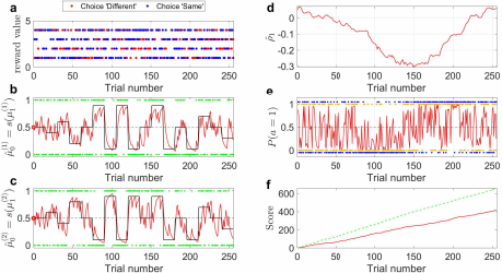 图 3:博弈任务中贝叶斯智能体后验状态的时间动态过程。 (a)博弈任务的奖赏分布。两个选项 “Different”和“Same”的奖励分数值随机地从离散均匀分布U(1, 4) 中采样。蓝点是每个试次中“Same”选项选对时的奖励分数值,红点是每个试次中 “Different” 选项选对的奖励分数值。(b),(c) 贝叶斯智能体对臂 A和 B的概率估计。绿点是感知输入(臂 A/B的状态)。红线表示臂A/B状态为1的后验概率估计。黑线是臂 A/B状态为1的真实概率。(d)模型捕捉到的自然参数的预测相关性。(e)贝叶斯智能体的决 策行为。橘黄色的点是模型在每个试次中做出的动作选择 a。蓝点是上帝视角下奖励最大时的理想动作 aideal(不一定是概率最优动作)。红线是两个臂 状态相同时的期望概率 (P (a =1)) 的轨迹。(f)模型的决策性能。绿色虚实线是采取理想动作时的累计最大奖励分数。红色线是模型实际累计奖励曲线,与理想条件下的最优性能保持相似的增长趋势。