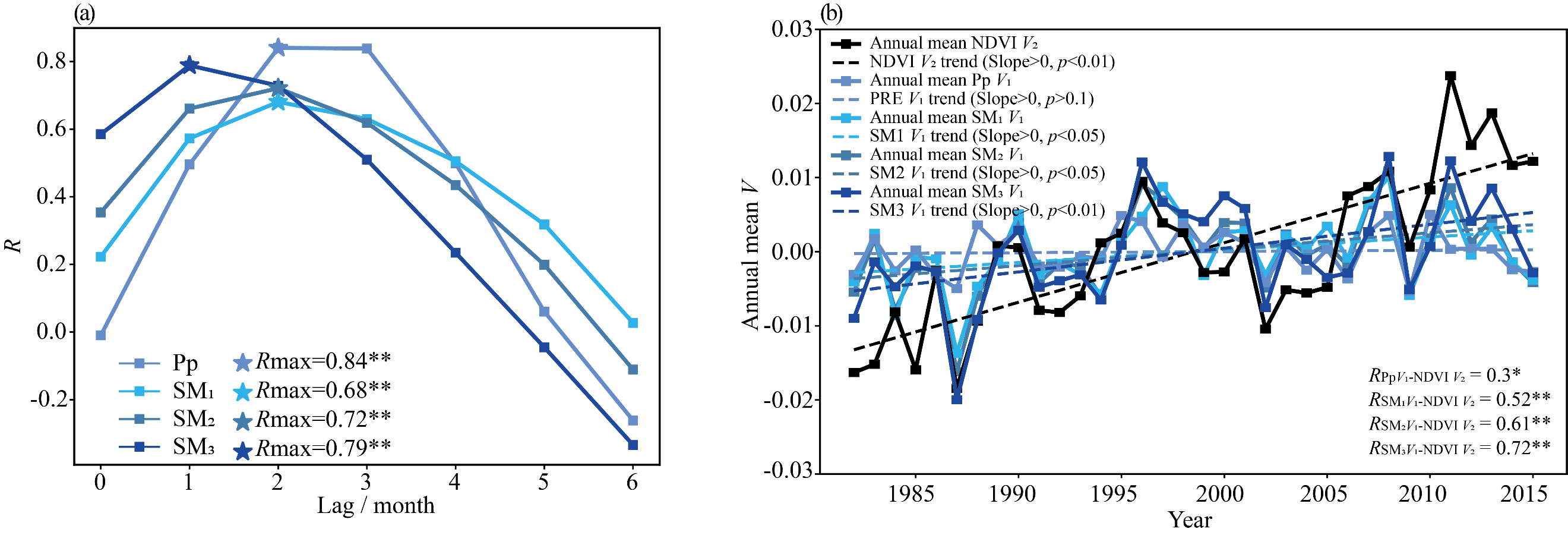 图2 NDVI第二大本征微观态的时间演化(V2)与降水(Pp)和三层土壤水(SM1-SM3)第一大本征微观态的时间演化(V1)之间的相关性。(a) 不同月份滞后情况下的相关性变化,(b) 时间演化的年均变化及其相关性,以及年均变化的趋势。