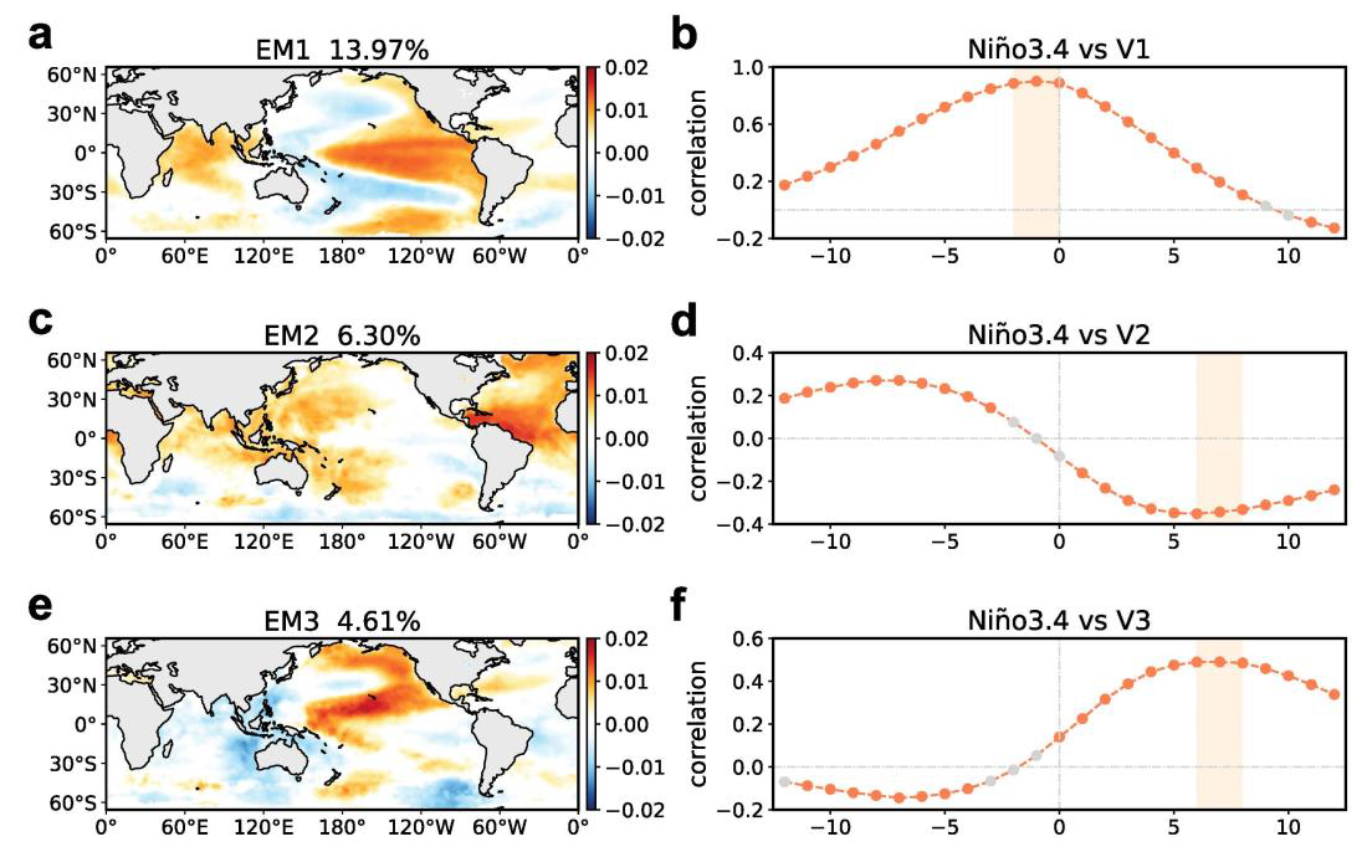 图1: 1950-2022 年期间,前三大本征微观态的空间分布及其对应的时间序列与 Niño3.4 指数的超前滞后相关系数。(a, c, e)中的百分比为本征微观态对应的解释方差。(b, d, f)为超前滞后相关系数,横坐标正值和负值分别表示 Niño3.4 指数滞后或超前于对应的本征微观态。橙色点表示相关系数通过了99%的显著性检验。