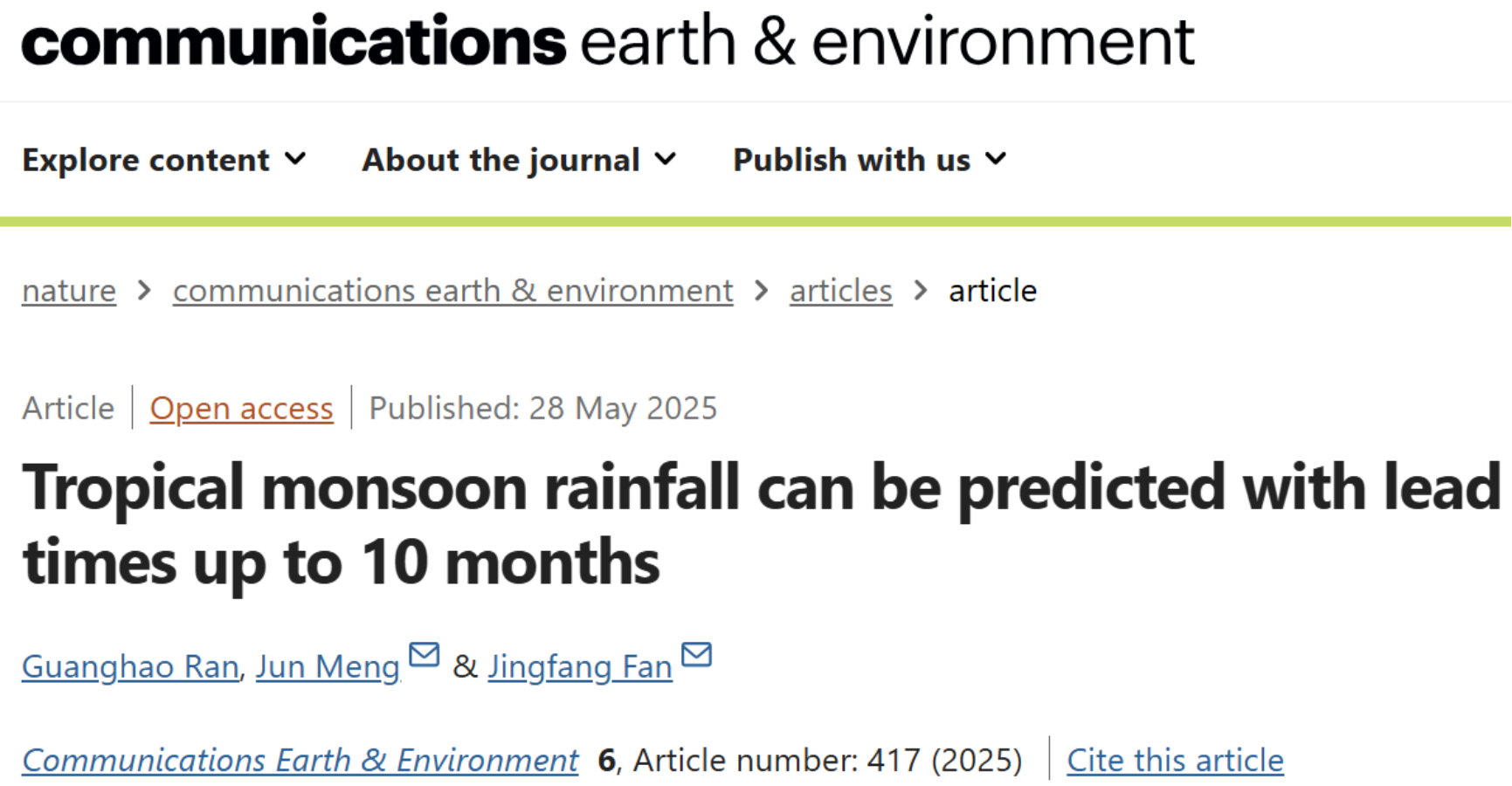 近日,万博体育app 樊京芳教授团队在Nature旗下权威国际期刊《Communications Earth & Environment》(影响因子8.1)正式发表题为《Tropical monsoon rainfall can be predicted with lead times up to 10 months》的研究论文。该成果由万博体育app 、香港浸会大学与中国科学院大气物理研究所联合完成。论文由香港浸会大学博士研究生冉光豪(北京邮电大学硕士毕业生)为第一作者,万博体育app 樊京芳教授与中科院大气物理所孟君副研究员为共同通讯作者。