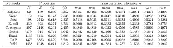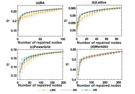 Table 1. The basic structural properties of real networks, and their transportation efficiency η when 20% repaired by different recovery methods. Structural propertes include network size (N), edge number (E), clustering coefficient () and average shortest path length (). We consider seven recovery methods: degree recovery (DR), betweenness recovery (BR), local betweenness recovery (LBR), k-shell recovery (KR), random recovery (RR), greedy recovery (GR), hybrid recovery (HR).