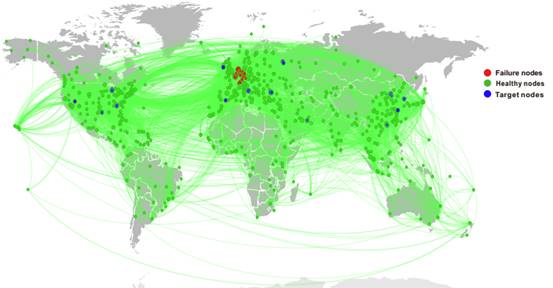 Fig. 1. Illustration of target recovery in complex networks. The network above is world airlines network and the green lines represent the airlines. Red circles, green circles and blue circles correspond to failure nodes, healthy nodes and target nodes respectively.