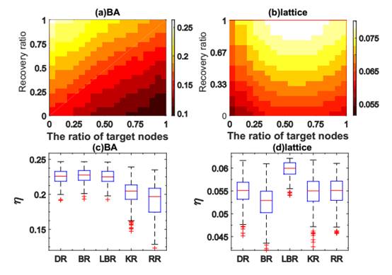 Fig. 3. (a, b) The transportation efficiency with different ratios of target nodes and different random recovery ratios in BA and lattice network respectively; (c, d) the transportation efficiency of target nodes when the network is 20% repaired by different recovery methods in BA and lattice network respectively.