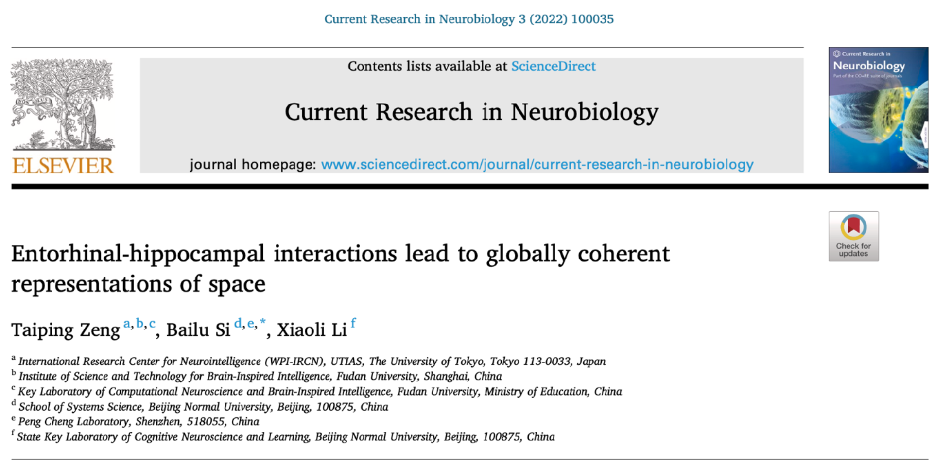 2022年第3期的《当代神经生物学研究》(Current Research in Neurobiology)发表了题为《内嗅皮层与海马交互形成空间全局一致编码》(Entorhinal-hippocampal interactions lead to globally coherent representations of space)的研究论文。该研究由东京大学曾太平博士在万博体育app 斯白露教授的指导下完成。该研究构建了一种内嗅皮层与海马交互作用的导航模型,从理论上为网格细胞可以作为动物导航的统一全局空间度量提供了依据。
