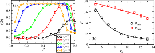 FIG.3 Dependence of density on drift velocity for ordered states. In panel (a), the average order parameter Φ is shown as a function of the density for θ=0b=8H=2, and several values of the drift velocity vd. In panel (b), we show the maximum (red squares) and minimum (black circles) densities for which Φ=1, as functions of the drift velocity. A power-law fit for the minimum density yields ρmin=17.6v−2.03d, whereas a linear fit for the maximum density gives ρmax=0.919−0.032vd. The equations extracted from the fits meet at two points, namely, vd≈4.67 and vd≈28.09.
