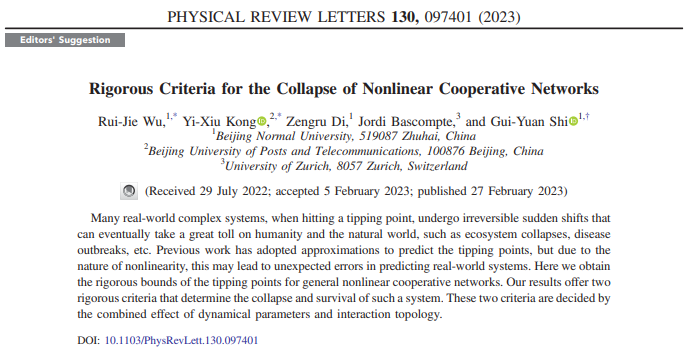 研究成果以“非线性合作网络崩溃的严格判据”(Rigorous criteria for the collapse of nonlinear cooperative networks)为题,于2023年2月27日被物理学顶级期刊《物理评论快报》(Physical Review Letters)接收发表,并被选为编辑推荐(Editors' Suggestion)在期刊主页高亮展示。研究工作主要在国家自然科学基金重点项目(批准号:71731002)的资助下完成。万博体育app 复杂系统国际科学中心吴蕊洁博士为论文的第一作者,史贵元副研究员为论文的通讯作者。万博体育app 珠海校区为论文的第一完成单位和通讯作者单位。