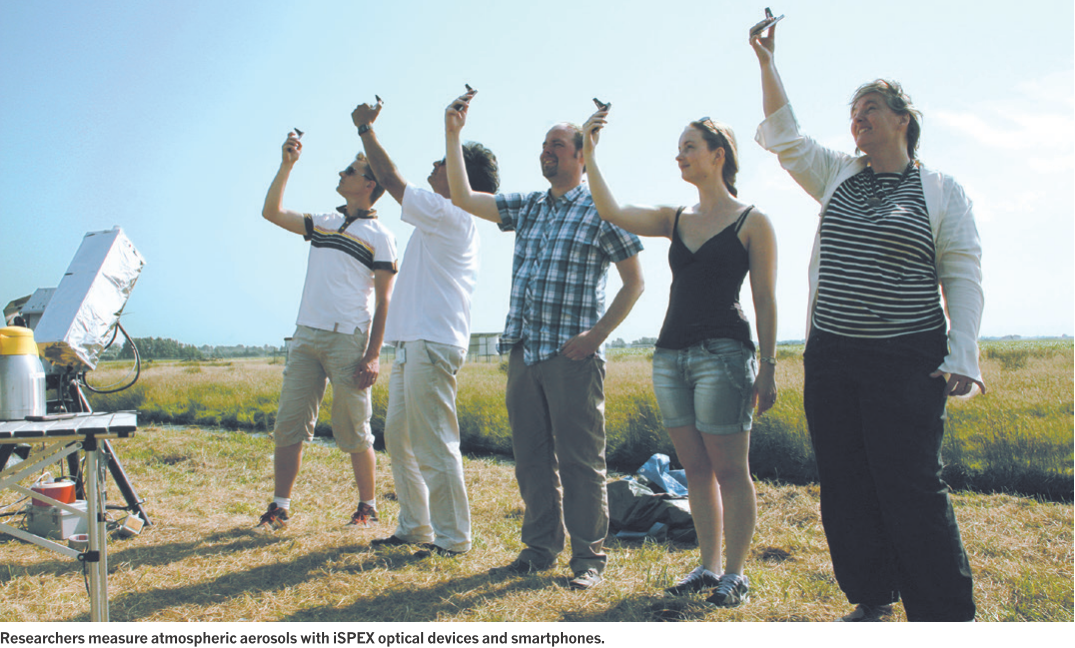 “我们在想,为什么不能把每个人每天都揣在口袋里的科技用起来呢?”2013年,Snik和他在荷兰莱顿大学的同事们向本国至少8000位iPhone手机用户赠送或售卖了一款叫做iSPEX的光学设备。这些使用者根据使用说明,安装好配套的app,然后就可以用手机去拍摄当地的天空。这种众包的方式在一天之内就构建起了一个在线的光谱数据库,得到了空前精确的荷兰大气粒子分布图,并且这些是在观测卫星发射之前用很小的花费完成的。此后,这个团队得到了欧盟的资助,以将项目推广到11个欧洲城市。