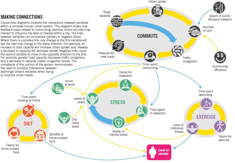 Causal-loop diagrams illustrate the interactions between variables within a complex human urban system. This diagram shows how feedback loops related to commuting, exercise, stress and diet may interact to in­uence the level of obesity within a city. The links between variables can be positive (yellow) or negative (blue). Where there is a positive link, any change to the ‑rst variable will see the next one change in the same direction. For example, an increase in road capacity will increase urban sprawl, and, likewise, a decrease in capacity will decrease sprawl. Negative links cause the second variable to move in the opposite direction to the ‑rst. For example, greater road capacity decreases trac congestion, and a decrease in capacity makes congestion worse. The complexity of this portion of the system demonstrates the need to consider interactions between seemingly distant variables when trying to improve urban health.