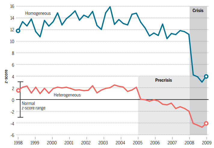 上图展示了两类个体的时序分析,它们分别是在同一时间互为借贷方的银行。虽然这种配对的原始数量并不能详细地体现可能正在进行的结构性变化,但是它们相对于随机网络模型的对比却可以体现这一点。Z分值代表的是在真实网络中银行配对数量偏离模型期望值的标准偏差的数量。小的Z分值(<3)表明真实数据与模型几乎是一致的,大的Z分值表明统计上的显著偏离。其中,我们用到了两种随机网络模型:一种是同质网络模型,它的总边数与实际网络相同(顶部);另一种是异质网络模型,其中每个银行的连边数都和真实网络一致(底部)。同质网络模型经常被用到标准性分析中,它只能着重显示出晚期的,突然发生的结构性改变(2008)。异质性模型更具现实意义,它还能够分辨出渐进式的,并能够在危机前三年的阶段给出预警(2005-2007)。[修改自(2)]