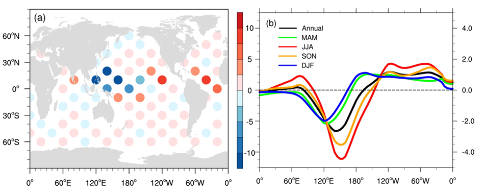 图1. WPSH强度对海温扰动位置的敏感性图。(a) 基于80组单贴片试验得到的WPSH强度对全球区域海温升高1K的响应。红(蓝)点表示随指定区域升温而增加(减少)的WPSH强度。(b)在(a)的基础上计算了30°S-30°N范围经向平均敏感性的年平均和季节平均结果(详见图例)。单位为gpm K-1。